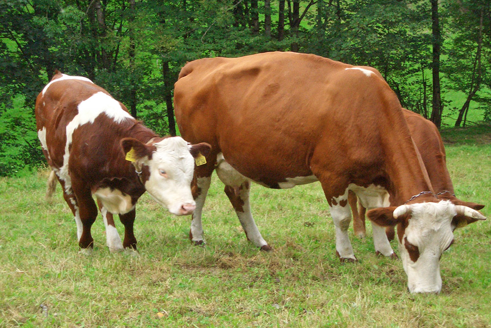Die Mutterkühe mit ihren Kälbern sind von Frühjahr bis Herbst auf den saftigen Weiden oberhalb des Hofes. Über die kalte und schneereiche Jahreszeit im Winter werden sie in den Ställen untergebracht und mit Heu, Öhmd und Silage gefüttert.